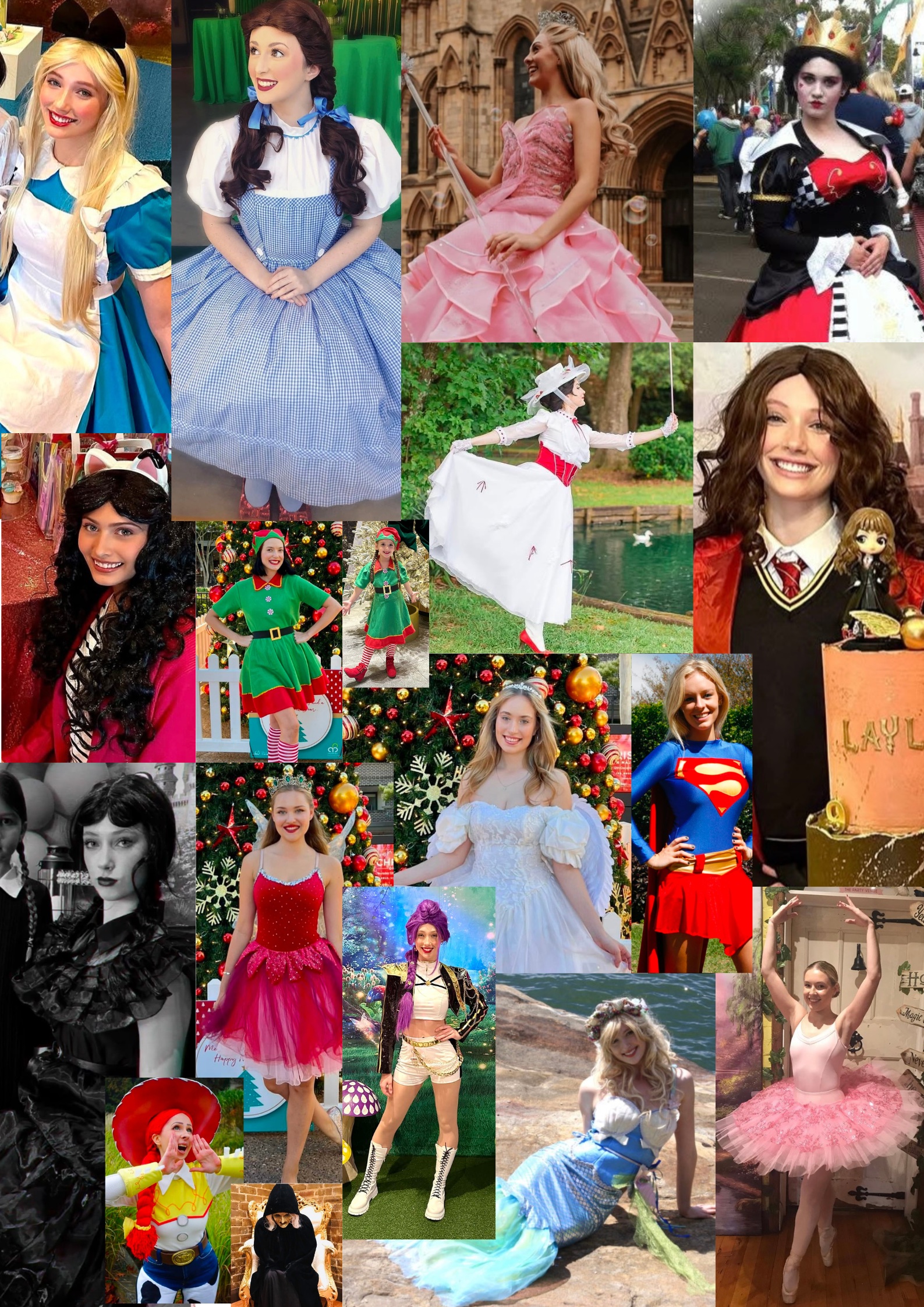 Popular female characters include: Fairy, Disney Princesses (Elsa, Anna, Cinderella, Sleeping Beauty, Rapunzel, Belle, Jasmine, Snow White, Ariel, Merida, Moana), Tinkerbell, Generic Princesses (Princess Pink, Princess Rainbow, etc.), Mermaid, Unicorn Princess, Barbie (various styles), Encanto (Isabela and Mirabel), Princess Peach, Alice in Wonderland, Queen of Hearts, Dorothy, Glinda, Elphaba (The Wicked Witch), Hermione, Wonder Woman, Supergirl, Mary Poppins, Wednesday Addams, Angel, Minnie Mouse, Poppy Troll, LOL Doll, Jessie from Toy Story, Ballerina, Taylor Swift, Elf/Pixie, Disco Diva, Sesame Street Host, Christmas Fairies, Angels & Elves, Old Scary Witch, The Fairy Godmother and our newest character Rumi from K Pop Demon Hunters.